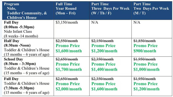 为庆祝欣斯戴尔蒙特梭利学校的开业,校方提供”创校家庭“优惠,为前20个入学家庭提供特别优惠。作为创校家庭,特殊优惠的学费将在孩子整个就读期间保持不变。