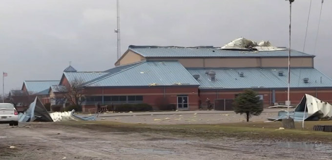 伊州中部地区的Village of Forrest,一所高中的屋顶被龙卷风掀翻