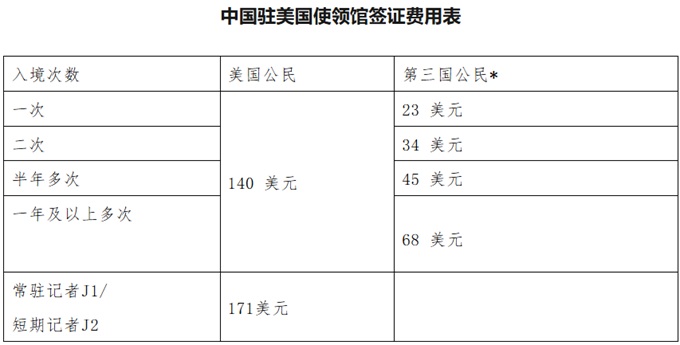 注:*1. 部分第三国公民申请中国签证的收费标准不同,具体请以使领馆解释为准。