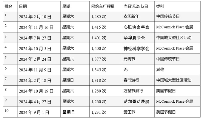 抵达中国城网约车行程最多的前十天中,三天对应中国城附近McCormick Place的大型会展活动,两天为中国传统节日,两天为中国城举办大型社区活动,两天为美国节假日。入围前十的,仅有11月9日无法找到对应因素。