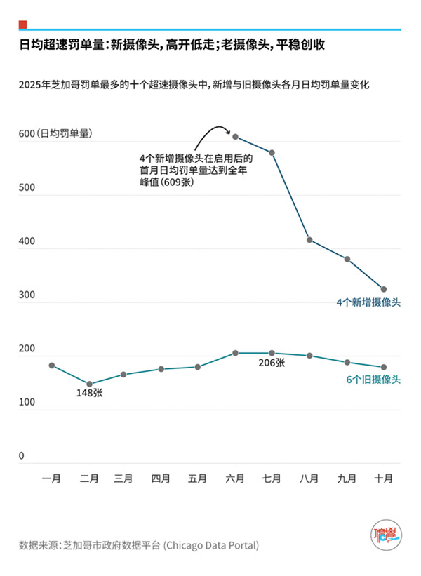 数据显示,4个新增摄像头在启用后的首个月日均罚单量达到全年峰值,随后逐月回落。相比之下,6个旧摄像头在全年各月的日均罚单量基本保持稳定。纵观全年,4个新摄像头的日均罚单量明显高于6个旧摄像头。