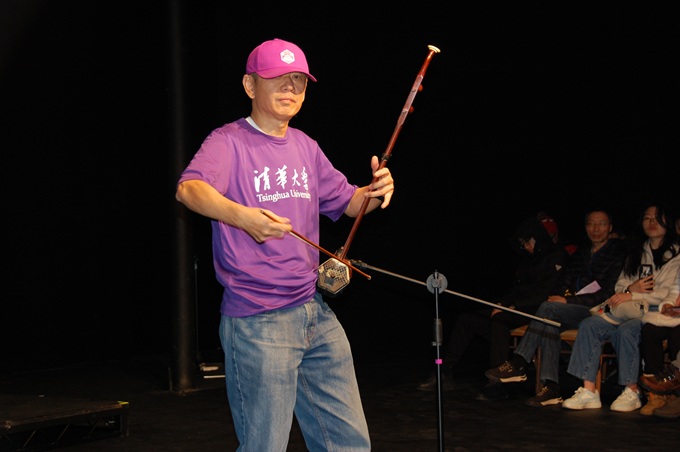清华土木系校友胡杨演奏二胡独奏《赛马》,运用拨弦等技法模仿马蹄声,展示群马奔腾的音响效果