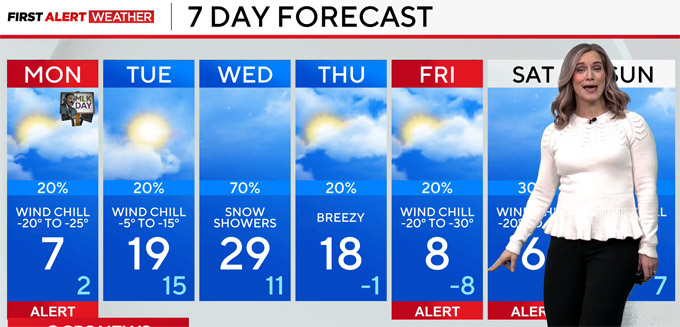 本周三气温将显著回升,但随后又将是新一轮大降温,本周五、周六又将是酷寒预警,周五最高气温华氏8度,最低气温华氏负8度,寒风中的最低体感温度低至华氏负30度(摄氏零下34度)。