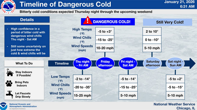 国家气象局发布针对芝加哥地区的酷寒预警,周四、周五被列为危险级别