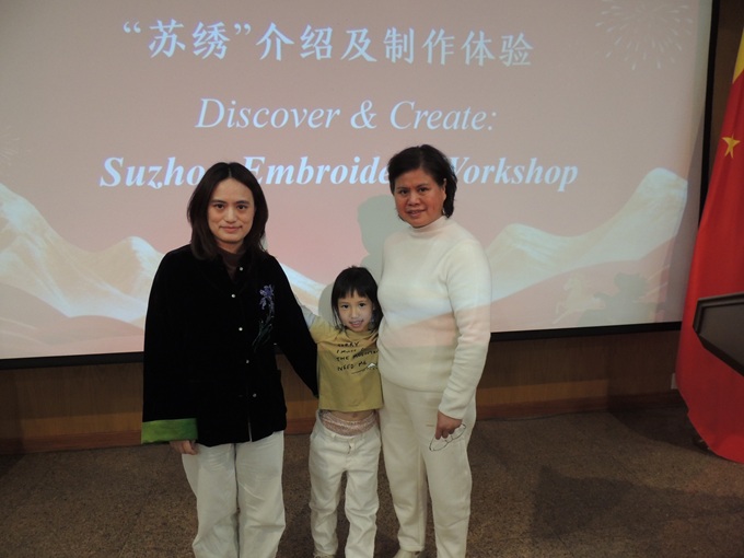 张宜琪副总领事、王义教育参赞在学习苏绣