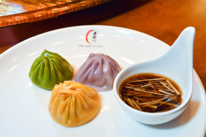 老四川的三色小笼包,加入胡萝卜汁、紫薯汁、菠菜汁,以热气腾腾的方式呈现黄、紫、绿三色,纯天然健康美食,猪皮冻与可口的肉馅,美味爆汁!记得灌汤小笼包趁热吃味道口感最好哦。