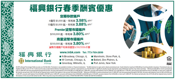 总部位于芝加哥西郊的福兴银行(International Bank of Chicago)是一家与华人社区共同成长的银行,也是一家真心服务华人社区的银行。在马年新春即将到来之际,为答谢各界客户的支持,特别推出上述春季大酬宾活动,以最好的存款利率回馈社区!