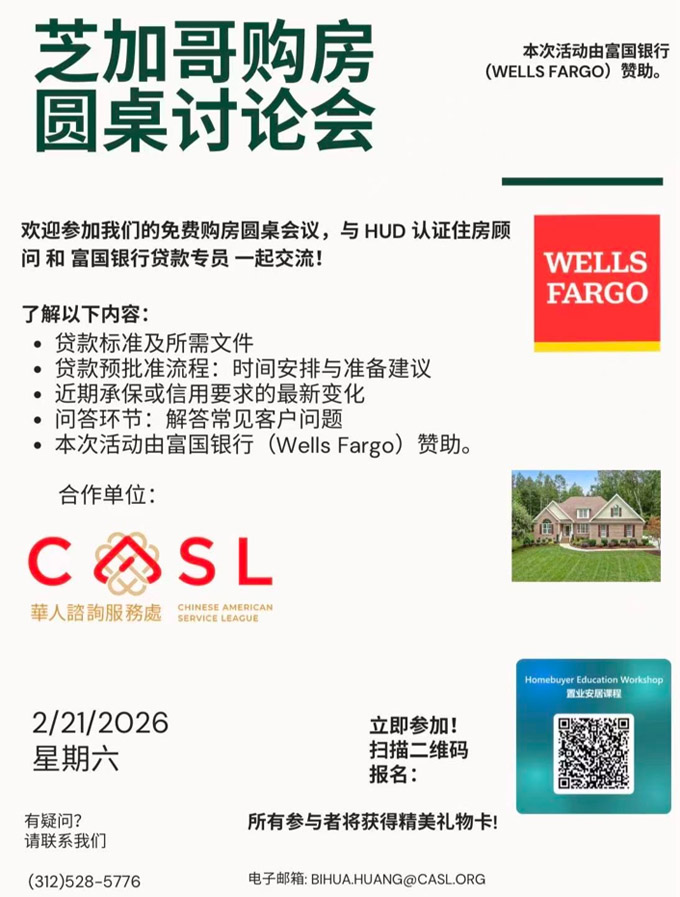 在美国买房无疑是一个繁琐且复杂的过程,为了帮助广大华人朋友实现美国梦,华人咨询服务处、富国银行(Wells Fargo)将于2月21日推出《芝加哥购房圆桌讨论会》,由HUD认证的住房顾问、富国银行贷款专员将为您答疑解惑。