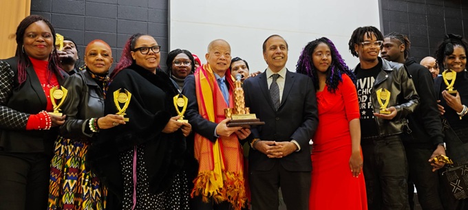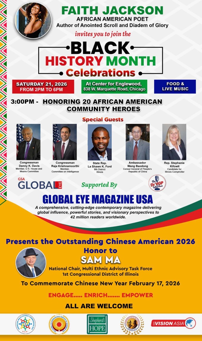 【芝加哥侨学网讯】芝加哥著名非裔诗人费斯·杰克逊(Faith Jasksong)2月21日在英格伍德社区中心(Center of Englewood)举办“黑人历史月”庆祝活动,各界政要嘉宾在庆祝非裔传统文化的同时,也恭贺中国新年,并向芝加哥知名侨领马森柱颁发“杰出华裔美国人”奖,表彰马森柱先生多年来为芝加哥少数族裔社区所作出的杰出贡献。