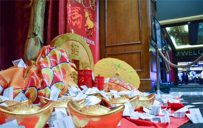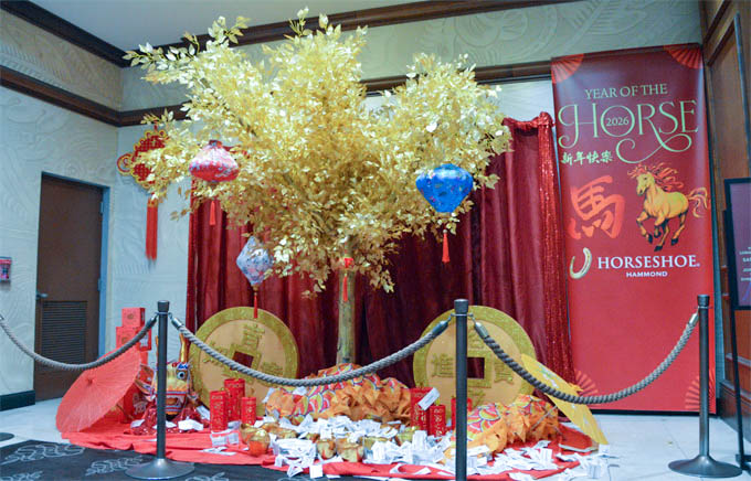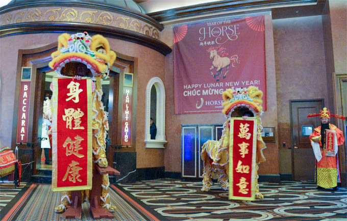 马年新春,洋财神驾到!距芝加哥中国城仅20分钟车程的马蹄铁(Horseshoe Casino)张灯结彩,大红灯笼高高挂,全场舞狮欢庆中国新年。