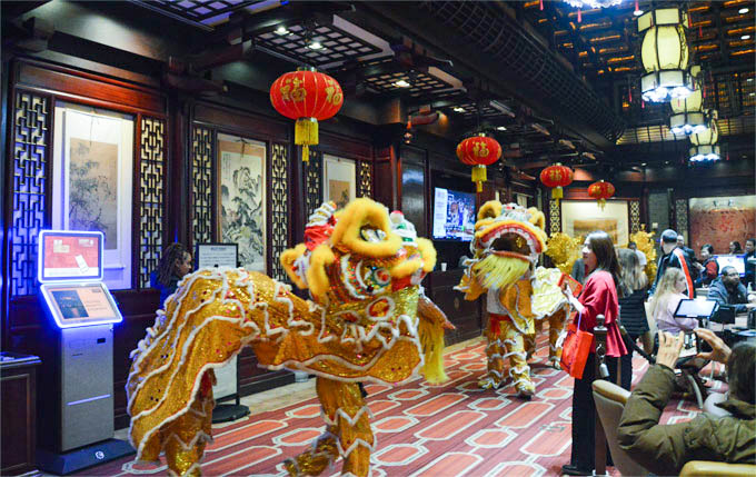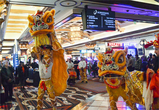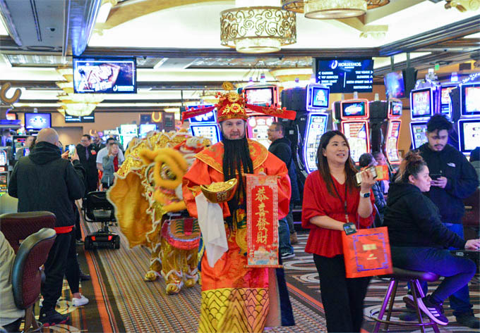 步入金碧辉煌的娱乐博彩大厅,则是瑞狮狂舞、锣鼓喧天,热闹祥和。马蹄铁的各族裔员工们身穿传统服饰与舞狮队一起绕场一周,向客人们分发新年糖果,把中国新年的喜庆与欢乐带给大家。