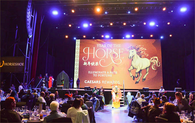 特别值得一提的是,马蹄铁舞狮贺岁当天,恰逢盛大的Bill's Game Show酬宾庆典,拥有Caesars Rewards的七星会员至尊贵宾、钻石会员的千名贵宾欢聚在马蹄铁二楼The Venue剧场,该剧场平时是各种演唱会与大型聚会的举办地,酬宾当天则变身盛大宴席,来宾们享受美酒美食,参与各种惊喜抽奖,全场欢呼喝彩不断。
