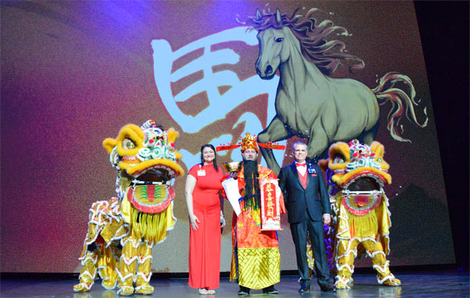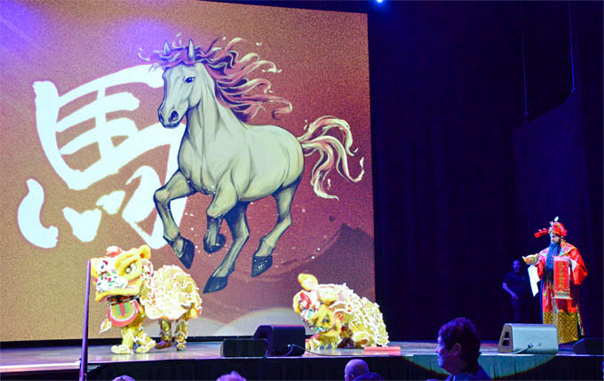 贺岁舞狮队与财神的到来,更让全场氛围推向高潮。马蹄铁总经理比尔·哥斯塔森向各族裔来介绍了中国新年的文化特色,马年的吉祥寓意,祝福新年好财运。