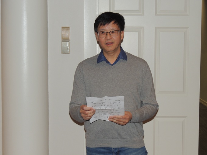 芝加哥、洛杉矶两地教授协会连线庆祝春节,芝加哥会场,美国华裔教授学者协会会长李永田(左)致辞