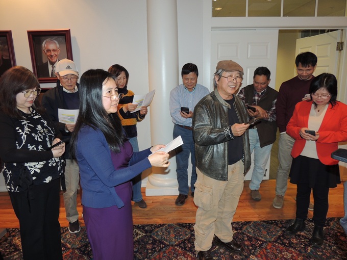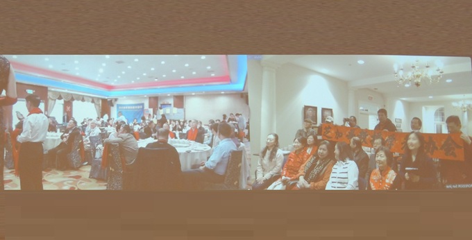 芝加哥、洛杉矶两地教授协会连线庆祝春节,洛杉矶会场,芝加哥教授学者协会会长王坚(前右)致辞