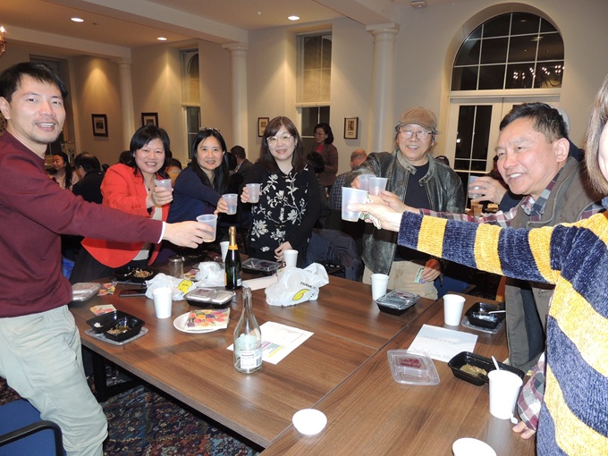 会议厅禁止饮酒,大家畅饮无酒精葡萄酒,其乐融融,增添了庆祝春节的喜乐气氛。