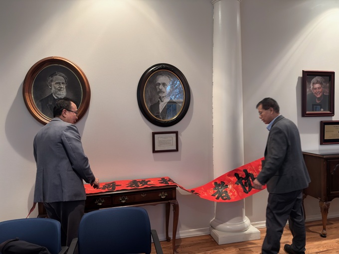 芝北中文中心校长孙彦钊(右)还带来“芝加哥教授学者协会”高雅书法横幅