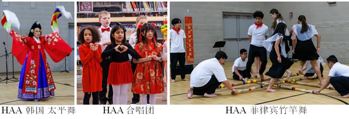 社区私立PreK–12学校HAA派出了强大的学生阵容,参加了全部三场庆祝活动,并带来了竹竿舞、儿童合唱团和韩国太平舞等富有民族特色的表演。
