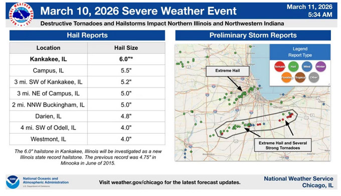 根据国家气象局周三公布的官方记录,在受灾最严重的南郊肯卡基郡,多个市镇都出现直径超过5英寸的冰雹。肯卡基郡离芝加哥市区约1.5小时车程,在离芝加哥市更近的Westmont, Darien,也出现了直径达到或超过4英寸的冰雹。
