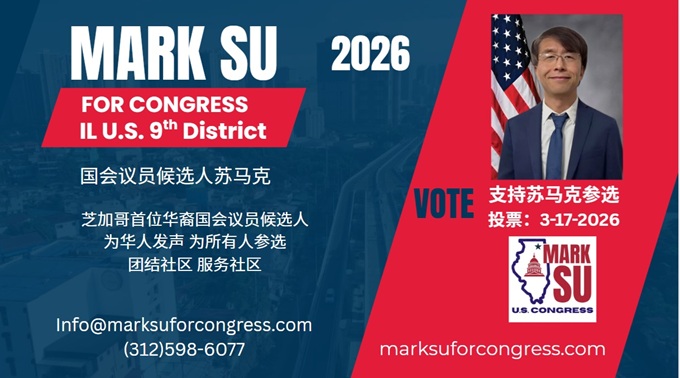 在第9区的芝加哥区包括:Lincoln Square, Ravenswood, Uptown, Edgewater, Rogers Park, West Ridge. 芝加哥北华埠属于Uptown. 苏马克选举委员会希望大芝加哥地区的华人支持Mark Su 的参选,因为他是伊利诺伊州历史上该区首位华裔国会议员候选人,他参选的一个目标之一也是代表华人发声,增加华裔与其他族裔的交流。凡是在上面所列的31个市镇里的华裔注册投票居民都可以投Mark Su的票,请选择共和党选票34号候选人Mark Su。