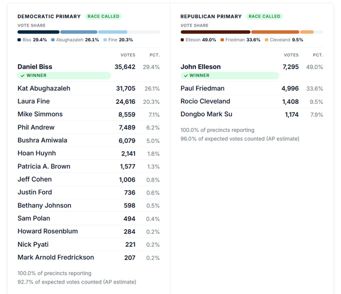 在民主党阵营中,北郊艾文斯顿(Evanston)现任市长毕斯(Daniel Biss)以29.4%的得票率赢得党内提名。共和党派候选人John Elleson则以49%的得票率胜出。