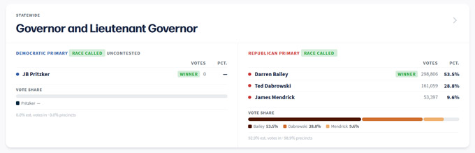 在3月17日的初选中,民主党派阵营无人挑战现任州长。共和党派阵营则有三位候选人争夺提名,最终拜雷(Darren Bailey)以53.5%的绝对优势胜出。