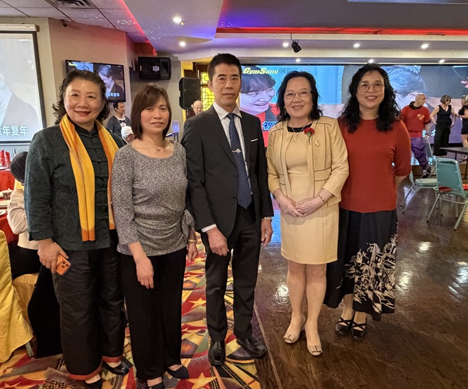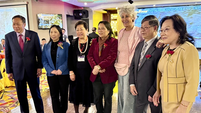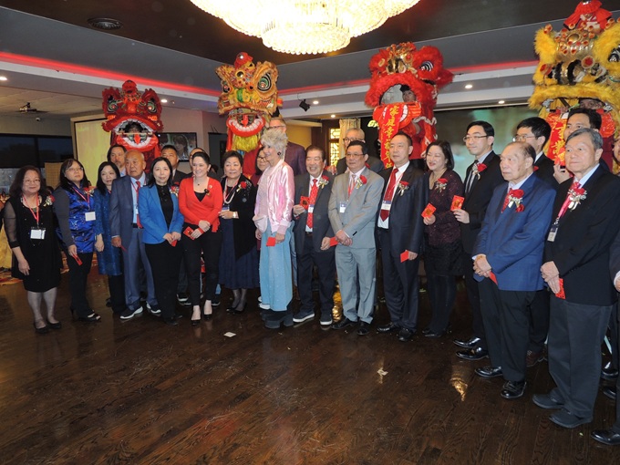 左上起,伊州财长方仲华、伊州审计长Susana Mendoza、伊州议员马静仪、11区区长李惠华、25区区长卢汉士、库克郡财长帕帕斯等美国政府官员热情致辞