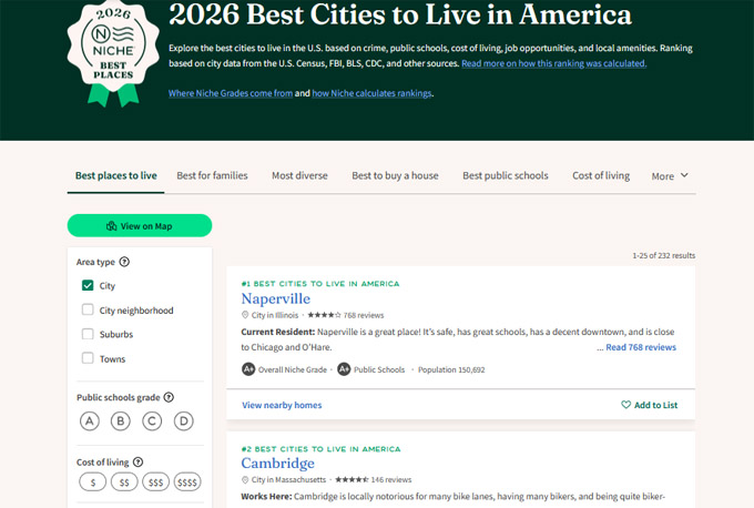 Niche 2026美国最宜居城市放榜,芝加哥西郊瑞柏市(Naperville)排名第一