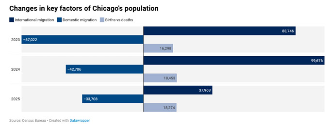 2025年芝加哥市区的国际移民总量减少了约3.4万,2024年则减少4.3万。2023年虽然有“德州大巴”给送来的2.6万名移民,但当年芝加哥市国际移民的数量却大幅减少了6.7万。不过,过去三年来芝加哥市“国内移民”(从美国其它地方搬来芝加哥的居民)的数量均是显著增长,并且每年都可完全抵消了国际移民减少的影响。尤其是2024年,芝加哥市区的国际移民虽然减少了4.2万,国内移民却增加了近10万。