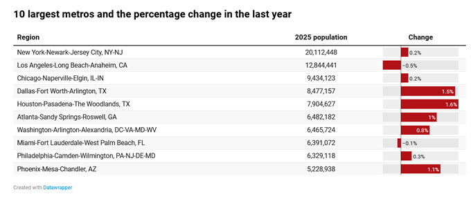 根据美国人口普查局最新资料,2025年纽约大都会地区人口增长了0.2%,继续已2000万左右的总人口稳居全美第一。洛杉矶地区总人口约1300万,人口减少了0.5%位居第二。大芝加哥地区继续位居第三,总人口940万,增速0.2%。