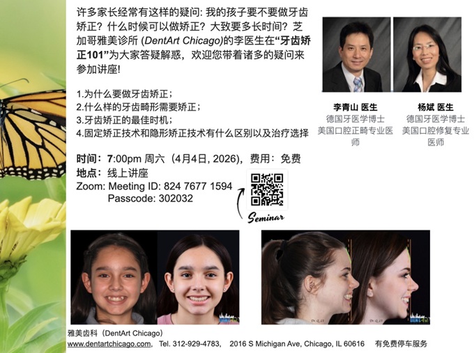 【芝加哥侨学网讯】芝加哥雅美诊所(DentArt Chicago)的李医生在“牙齿矫正101”为大家答疑解惑,欢迎您带着诸多的疑问来参加讲座!