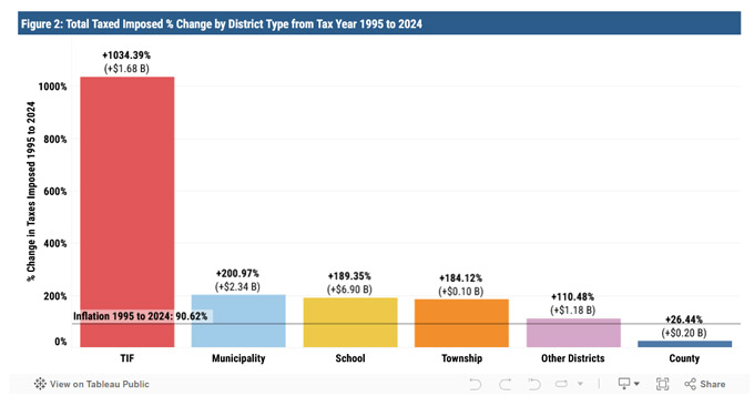 - 房产税增值税区(TIF)泛滥扩展。TIF税区让地方政府可以通过向私人开发商提供税收补贴的方式推动社区建设,不受伊州房产税涨幅限令的法律约束。过去30年TIF征税总额飙涨1000%,总额已高达18.4亿。