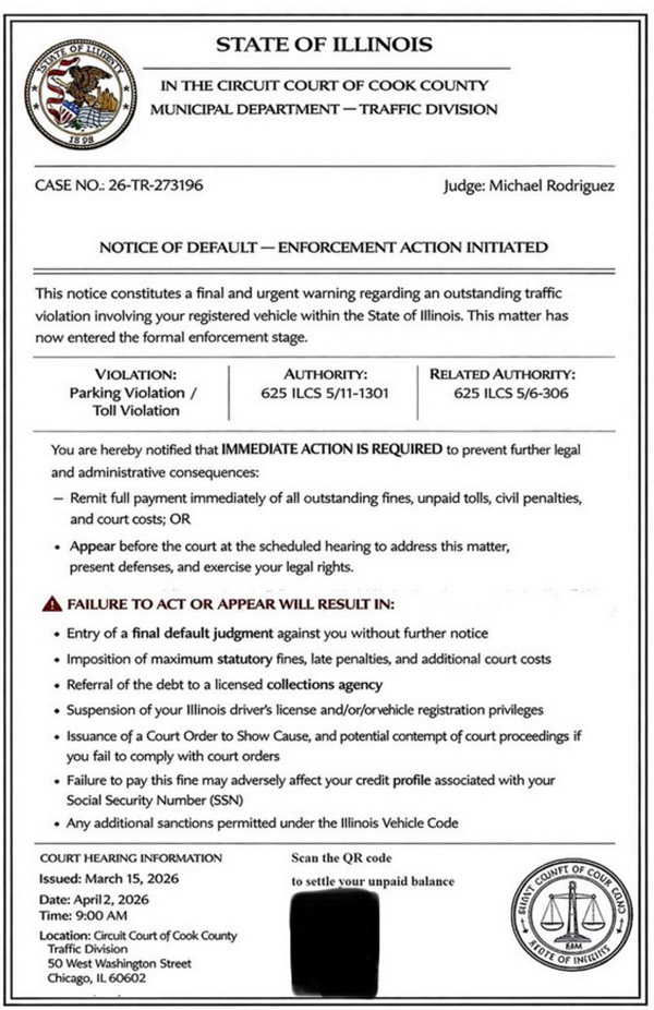 据悉,此类“法庭通知书”有很多版本,但共同特点就是催促和诱导收件人扫码付款,如果不照办,后果很严重,具体包括:法庭将作出最后的欠款裁决;处以最高罚款并须支付法庭费用;交由追债公司追债;吊销伊州驾照,等等。