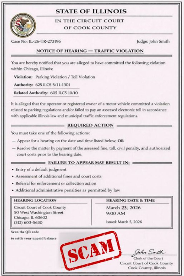 库克郡巡回法庭书记官马瑞亚娜(Mariyana Spyropoulos)日前发布公告指出,这类诈骗邮件以库克郡巡回法庭的名义寄出,以停车违规、拖车问题为由,要求收件者“立即采取行动”,要么付款,要么出庭。