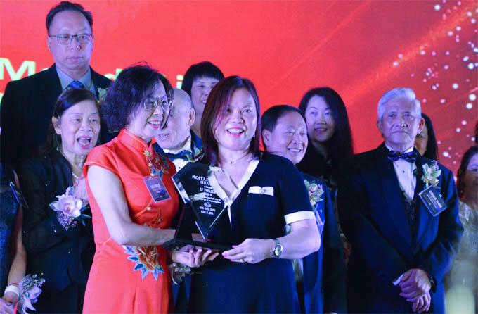 新任会长麦皓岚也是为会务奉献十多年的资深董事,由名誉会长朱庆龙(右)颁奖