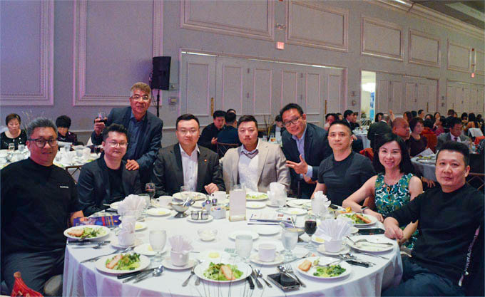 各界来宾与王保东总领事合影,左一为华联会主席黄正东,左四为华商会会长李建明,右三为芝加哥美国广东商会会长陈健明