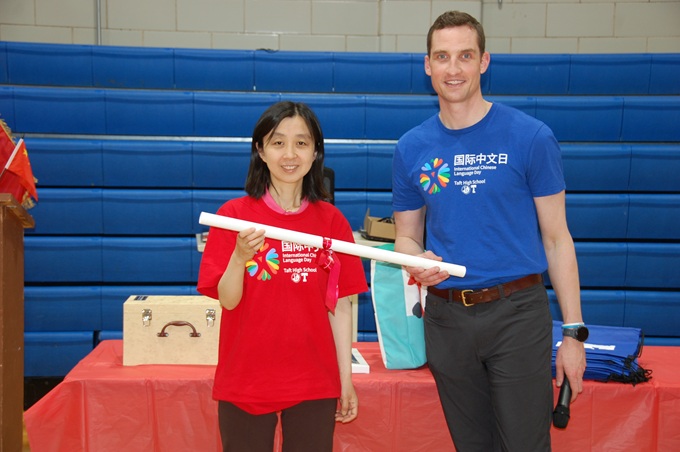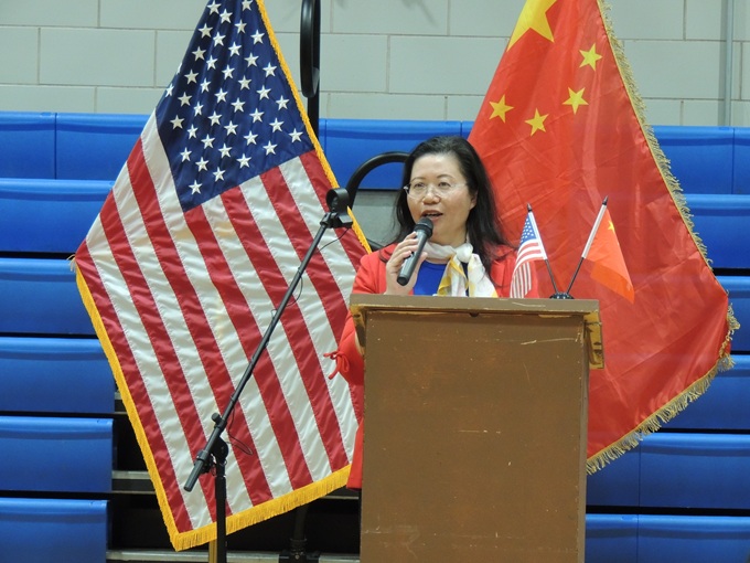 中国驻芝加哥总领馆王保东总领事讲,如今全球有超 2亿中文学习者,中文成为连接世界的重要纽带。我很高兴了解到塔夫特高中有300余名同学正在学习中文,今天我特意带来了中文教学用具和最新版中国地图作为礼物,辅助大家了解一个更真实、立体、全面的中国。
