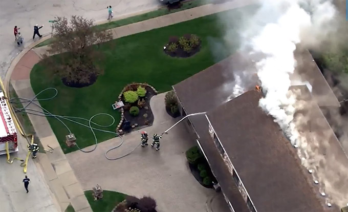 上周五晚间9:45左右,芝加哥西郊惠顿市(1400 Wendover Lane, Wheaton IL)一处民宅房顶起火。惠顿市消防局大批人员迅速抵达现场,在20分钟内灭火成功。火势虽然只让部分阁楼焚毁,但灭火过程让房屋内大量进水,已导致该处住宅变得无法居住。惠顿消防局认为,起火原因是雷击。