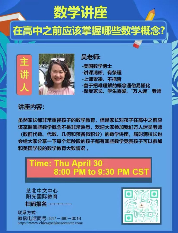 虽然家长都非常重视孩子的数学教育,但是家长对孩子在高中之前应该掌握哪些数学概念不是非常熟悉,欢迎大家参加我们万人迷吴老师(教下列课程:前代数、代数、几何、前微积分和SAT math)的数学讲座,届时满校长也会给大家分享一下每个年龄段的孩子都有哪些数学竞赛孩子可以参加以及参加这些竞赛的好处。