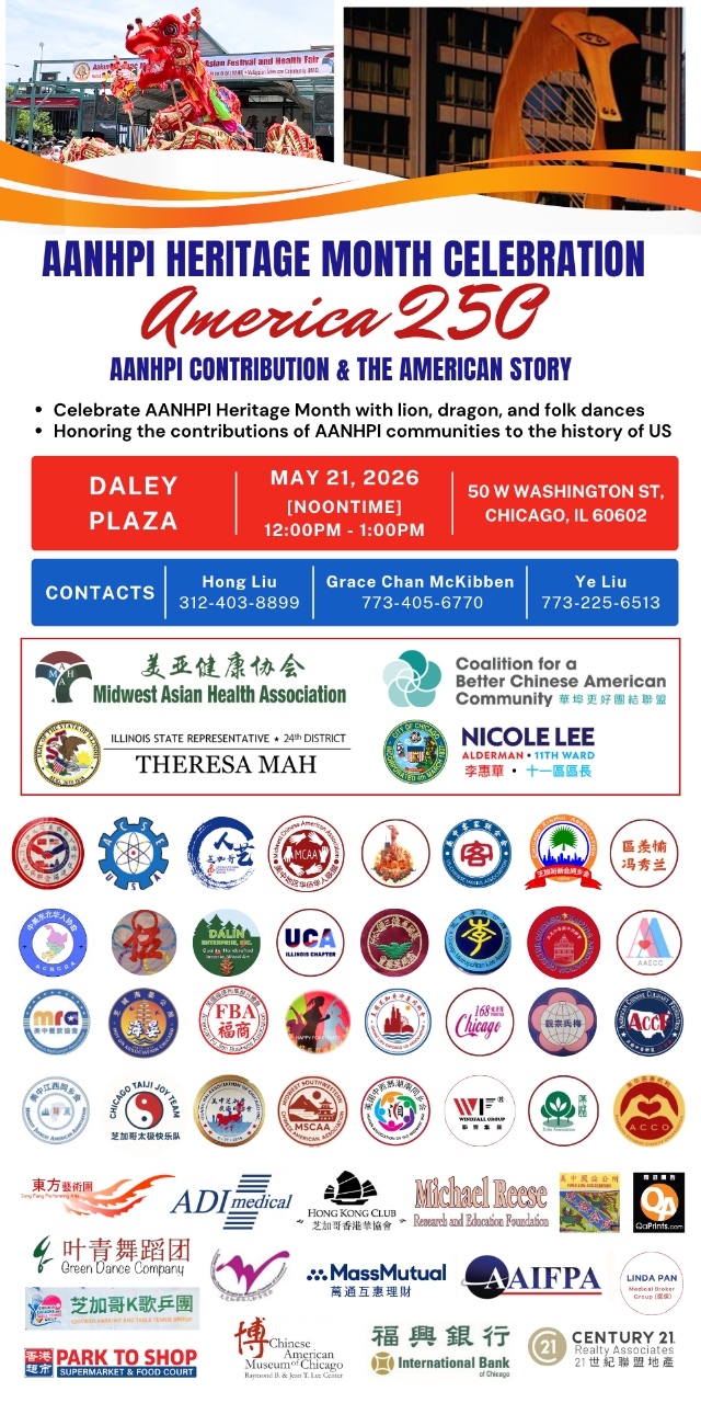 为庆祝亚裔美国人、夏威夷原住民及太平洋岛民(AANHPI)传统月,并纪念美国建国250周年,美中地区华侨华人在芝加哥市中心戴利广场(Daley Plaza)隆重举办“AANHPI Heritage Month Celebration – America 250”文化庆典活动。本次活动由美亚健康协会,华埠更好团结联盟,伊利诺伊州第24选区州众议员Theresa Mah(马静仪)及芝加哥第11区区长Nicole Lee(李惠华)联合主办,并得到近50个社团/公司的积极赞助和支持,包括美中地区华侨华人联盟,海外交流协会/五邑同乡会,美国华人联盟(IL-UCA),芝加哥广州协会,大芝加地区华人妇女商会,美国福建商会,人民艺术团,客家联合会,美国中餐联盟,美国人民对外友好协会,美中大西南同乡会,等(由于篇幅关系,参与社团及公司无法一一列举,请看海报logos) . 本次活动得到众多社区组织的大力支持与协办,充分体现了美中地区华人华侨的社区团结协作、共建共享的精神。此次活动将展示亚裔社区对美国历史与社会发展的重要贡献,弘扬多元文化精神,促进社区融合与团结。