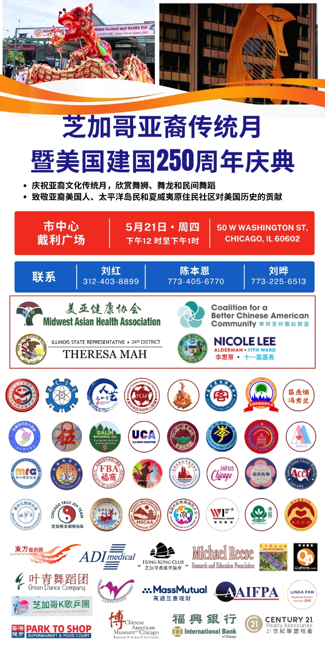 【芝加哥侨学网讯】美中地区华侨华人庆祝亚裔传统月暨美国建国250周年文化庆典将于5月21日中午在芝加哥市中心戴利广场隆重举行: