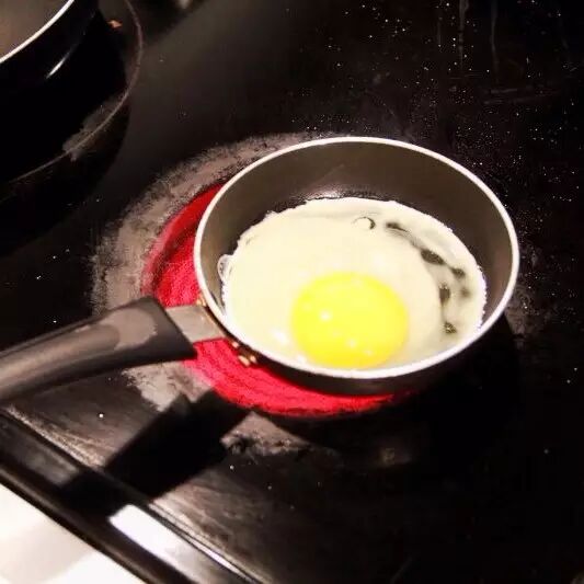 6、将混有芦笋香的油倒入煎蛋锅,做出荷包蛋。