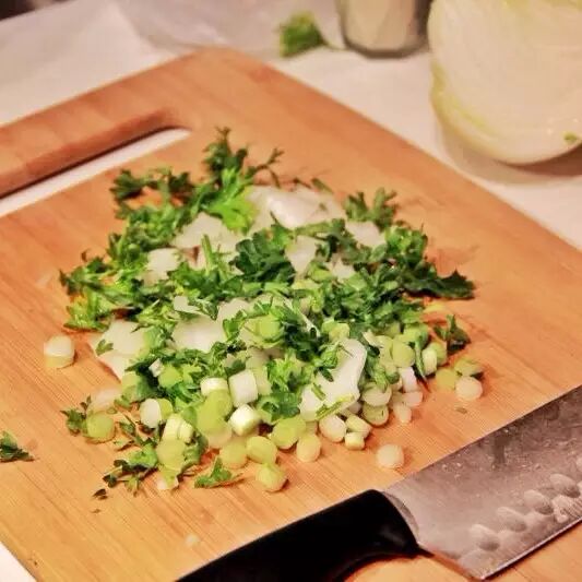 1、将欧芹、葱白、洋葱 洗净,切碎。在烤盘底部铺一张锡纸,将碎末放在锡纸上。