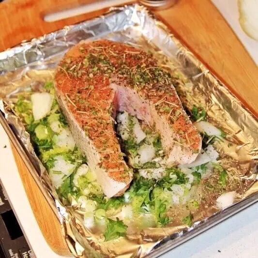 2、将三文鱼洗净,用厨房纸吸干水分。在一面用小油刷刷上少量橄榄油后,放到欧芹葱白洋葱碎末上,在另一面刷上油,撒少量盐,少量香蒜粉,并均匀撒上香料——迷迭香、欧芹碎、罗勒碎、黑胡椒。最后均匀淋上少许蒸鱼豉油。(还可在三文鱼表面切几刀,便于入味)
