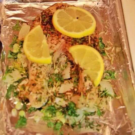 4、烤箱预热。将锡纸合起来包住三文鱼。Bake-Start 180℃(350℉)中层,15-20min(根据鱼肉大小和自己的烤箱来把握火候)。