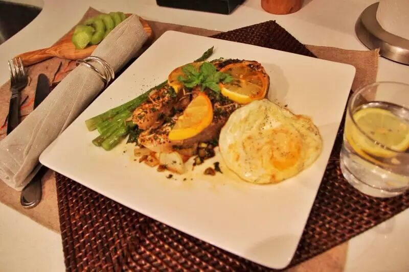 菜名:柠香欧芹三文鱼 配煎芦笋鸡蛋