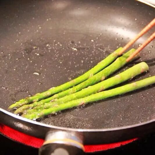 5、在烤三文鱼的过程中,将芦笋洗净,把芦笋底部老的地方切掉,可根据自己口味选择性切头。大火热锅,用橄榄油煎至熟透。