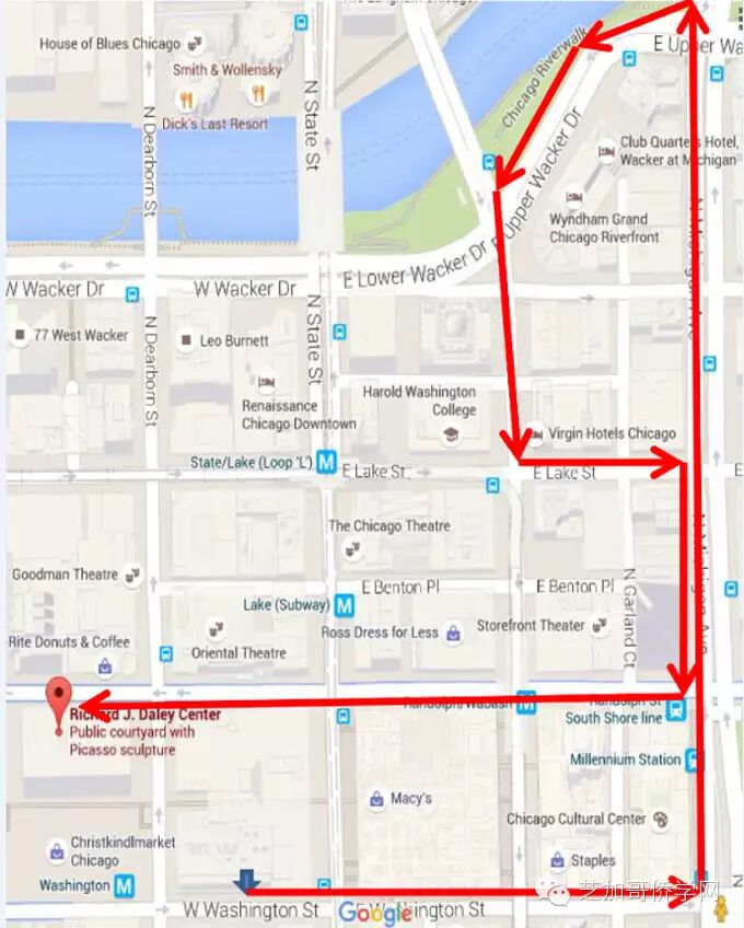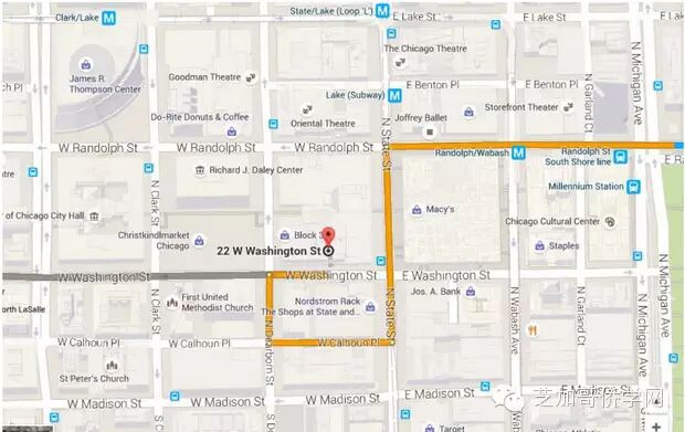 CTA:最近站点依次为蓝线Washington,红线Lake,棕绿橙粉线Randolph/Wabash。