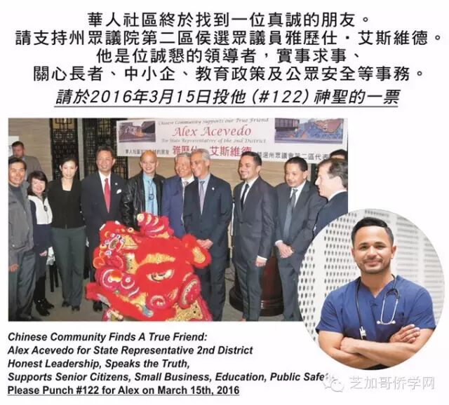雅历仕( Alex Acevedo)呼吁选民在3月15日投票支持他当选伊州议会第二选区众议员,投票请投#122。支持雅历仕的选民坚信:伊州第二区找到一位实事求是,言而有信,关心长者、中小企业、教育政策及公众安全的众议员。