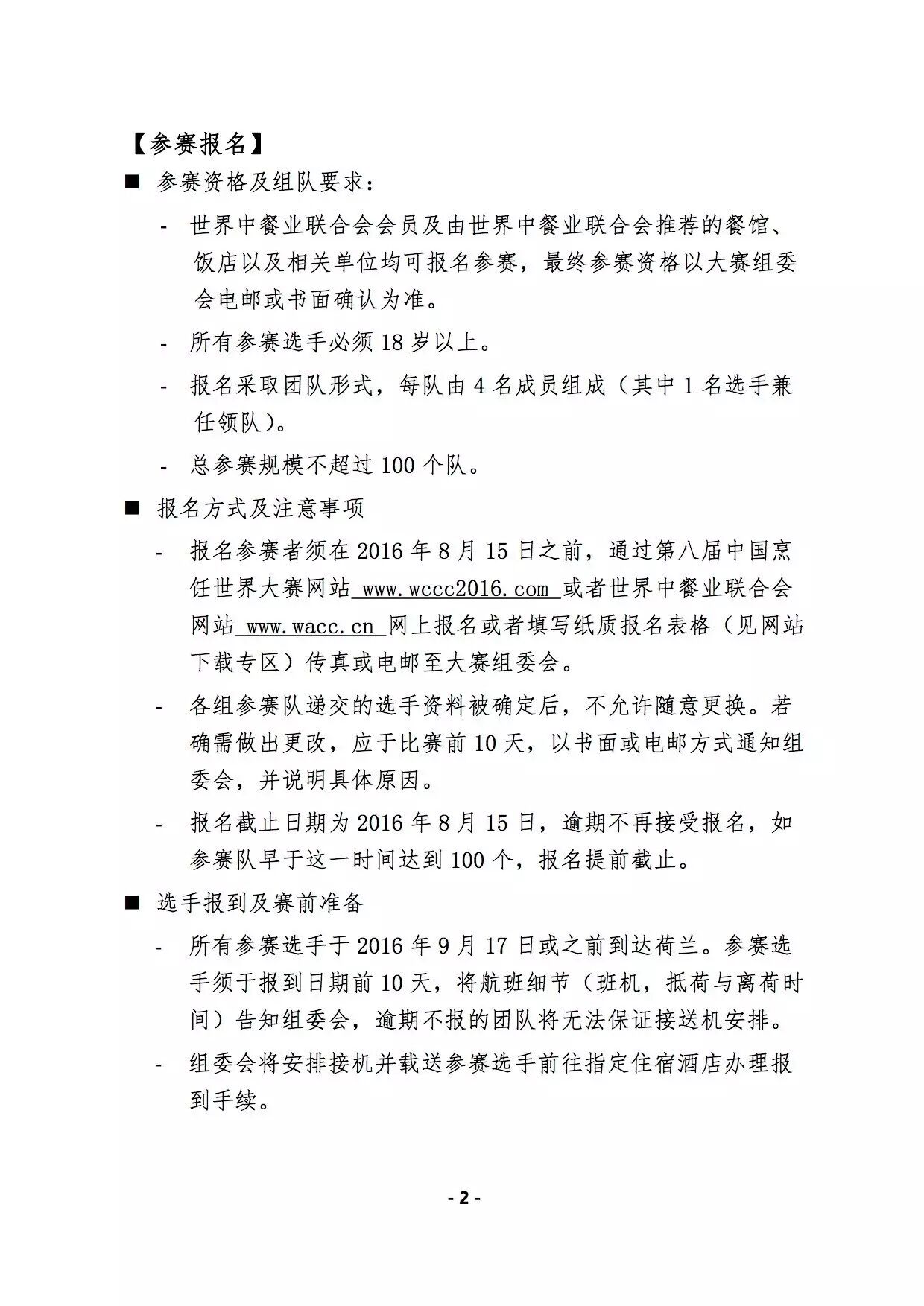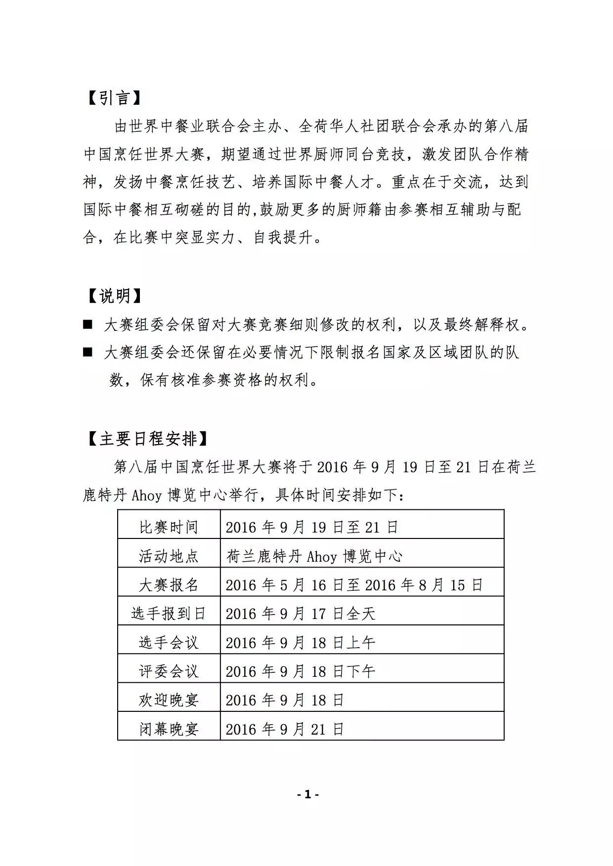 第八届中国烹饪世界大赛,将于9月17日在荷兰隆重举行,美国中餐联盟目前正在全美组织选拔与推荐参赛活动,欢迎美中地区中餐大厨报名参赛。大赛组委会将授予获奖队员奖牌、证书,世界中餐业联合会将授予特等奖选手“国际中餐烹饪名师”称号。已获得此称号的选手,将直接晋级为“国际中餐烹饪大师”。